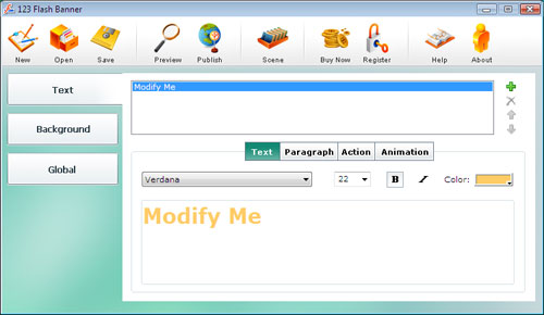123 Flash Banner je nástroj sloužící pro tvorbu flashových bannerů a inter (úvodů). Postup je jednoduchý: je třeba zadat text, zvolit písmo, animační efekty a nastavit barvu pozadí a obrázku. Při tvorbě intra a banneru lze pro každou scénu nastavit jiné barvy, písmo a texty. Když je design intra nebo banneru hotov, výstup lze uložit jako Adobe Flash movie, GIF image nebo AVI video.
