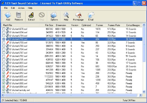 123 Flash Sound Extractor Vám pomůže extrahovat zvukové prvky z Flashových videí (SWF soubory). Vyjmutý zvuk je následně ukládán do MP3 formátu. Pracuje s Flash 3, 4, 5 a Flash MX. Podporuje hromadné extrahování souborů.
