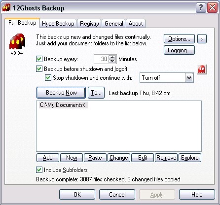 12Ghosts Backup je šikovný nástroj pro pokročilé automatické zálohování vašich důležitých dat. Zálohovat lze na lokální i síťové disky, USB externí disky i CD a DVD média (s potřebnými ovladači). Lze velmi podrobně nastavit adresáře pro zálohování, individuální intervaly zálohování, nebo spušění úloh při vypínání/odhlášení z počítače.