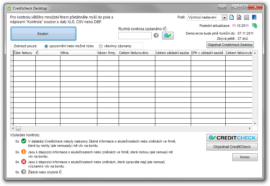 Program 2HCS Creditcheck Desktop je určen firmám a podnikatelům, kteří chtějí vědět jaká je kredibilita jejich obchodních partnerů. Můžete okamžitě prověřit až tisíce obchodních partnerů jednoduchým přetažením seznamu např. zakázek nebo vystavených faktur (ve formátu xls,dbf nebo csv) na tlačítko "kontrola". Nebo jednoduchým zkopírováním IČ do schránky např. z webu nebo z jiného programu. Program 2HCS Creditcheck Desktop využívá služeb společnosti Creditcheck s.r.o. (www.creditcheck.cz)