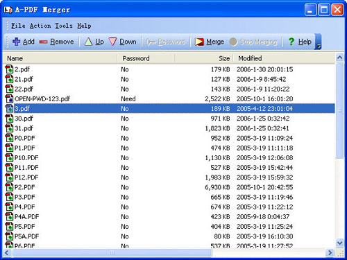 A-PDF Merger je program na slučování dvou a více PDF dokumentů (či obrázků) do jednoho výsledného PDF dokumentu. Program je nezávislý na Acrobat Readeru (pro jeho funkci jej není třeba mít nainstalován). Podporované obrázky jsou: BMP, JPG (JPEG), PNG, TIF/TIFF, GIF, WMF a EMF. Program navíc dále podporuje zaheslování dokumentu, metodu drag and drop (táhni a pus?) pro snadnou práci atd.