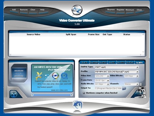 A-Z Video converter Ultimate je program, který má za úkol rychle a kvalitně konvertovat vaše videa do formátu pro přehrávání v Mp4 přehrávači a jiných přenosných zařízeních (Sony PSP, Apple iPod Video, 3G telefon, PMP, XBOX ...).