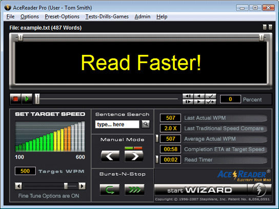 Někdo z nás má problémy se čtením (zadrhává, problémy s dyslexii, apod), proto pro vás máme tento program. Nejdříve zjistí vaší dočasnou rychlost čtení a potom vám jí pomocí určitých cvičení pomáhá zvýšit. Zvětšuje i čtecí fixační zónu vašich očí a pomáhá ji rychleji změnit. Výsledky je možno zobrazit v grafu. Neváhejte a vyzkoušejte tento naučný program! Musíte mít, ale zvukovou kartu, mikrofón a dobrou znalost angličtiny.