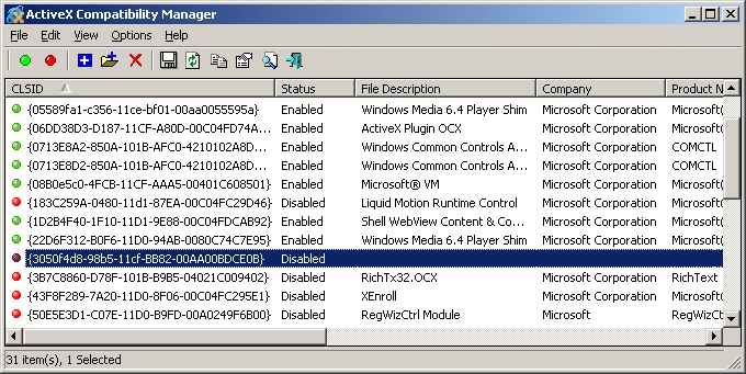 ActiveX Compatibility Manager je nástroj pro snadné vypnutí nebo zapnutí ActiveX komponentu webového prohlížeče Internet Explorer. Pokud chcete zakázat Vámi vybraný komponent ActiveX, stačí nastavit "kill bit" u požadovaného CLSID v následujícím klíči registru: HKEY_LOCAL_MACHINE SOFTWARE Microsoft Internet Explorer ActiveX Compatibility. Bližší informace naleznete na stránkách výrobce.