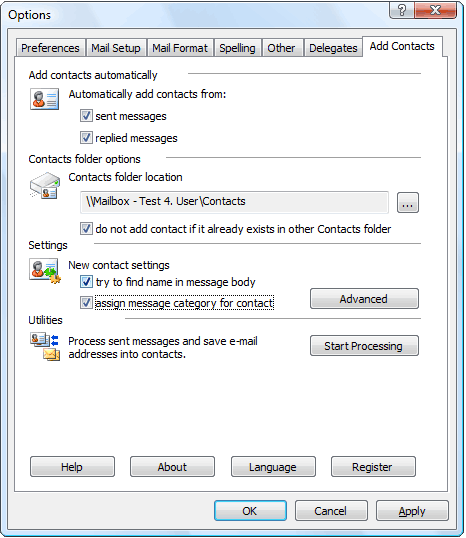 Add Contacts Vám pomůže vyhnout se ztrátám adres. Kromě toho shromážděné adresy mohou být použity pro filtrování pošty. Například, můžete použít pravidlo filtrování pouze některých odesílatelů (jejichž adresy jsou v adresáři), umístěných v samostatné složce, aby bylo zajištěno, že jejich zpráva bude řešena s větší prioritou a důležité zprávy nebudou ztraceny či vymazány nebo označeny jako spam.