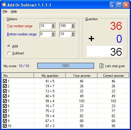 AddOrSubtract je užitečný nástroj, který pomůže vašim dětem s výukou matematiky. Obsahuje mnoho příkladů pro sčítání a odčítání, možnost nastavit obtížnost příkladů. Program zobrazí také výsledné skóre a procento správných odpovědí. Také nabízí možnost nakouknout do historie, a tak zjistit, které příklady byly chybně či správně zodpovězeny.