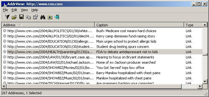 AddrView umožňuje analyzovat HTML stránky a získat většinu URL adres, které jsou v nich uložené. S AddrView lze také z URL extrahovat obrázky (<img>), odkazy na další soubory (<a> tag), CSS soubory, rámy, Flash soubory a další... Můžete si uložit seznam extrahovaných adres do textového, HTML nebo XML souboru, případně tyto adresy přidat ke svým oblíbeným.