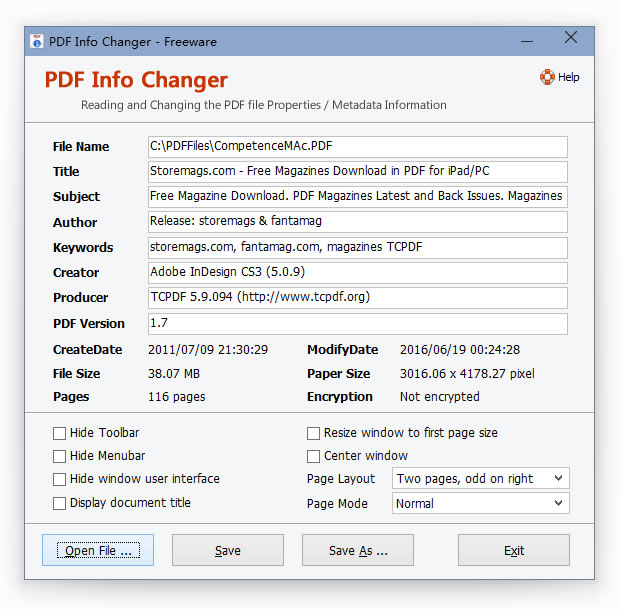 Adept PDF Info Changer je bezplatný nástroj pro čtení a změnu informací o vlastnostech souboru PDF. Poradí si také s modifikací atributů a metadat, ať už jde o název souboru, titulek, klíčová slova, verzi PDF, nebo třeba předmět.