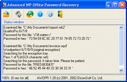 Advanced WordPerfect Office Password Recovery je software pro obnovu zapomenutého nebo ztraceného hesla v Corel WordPerfect Office dokumentech WordPerfect (*.wp, *.wpd), QuattroPro (*.qpw, *.wb?, *.wq?), Paradox (*.db). Podporována jsou i vícejazyčná hesla.