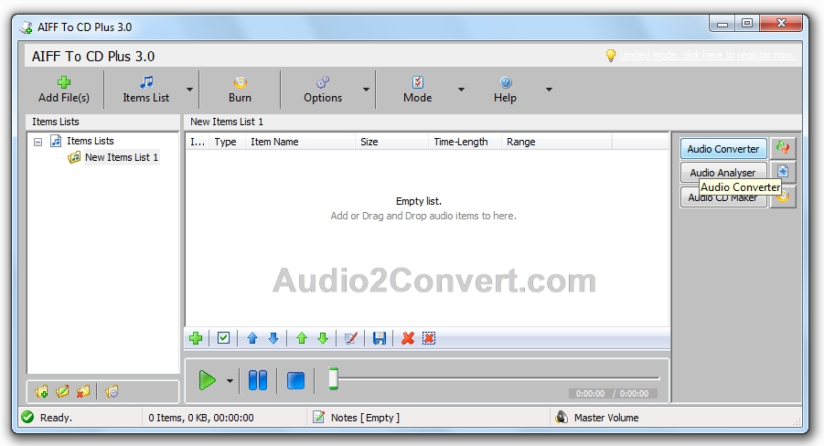 AIFF To CD Plus je program, který slouží pro převod a vypalování AIFF/AIF/AIFC souborů na audio CD. Následně lze i přehrávat zvukové soubory či spouštět další externí programy.