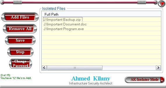 Aplikace AK-Isolator chrání vaše soubory pomocí izolace před poškozením. Je jednoduchá na použití, stačí zvolit soubor a vložit jej do programu stiskem tlačítka 'AK-Isolator Mode'. Nyní bude tento soubor chráněn před infikováním. Pro uvolnění souboru stačí zadat heslo.