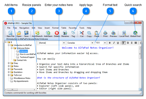 AlfaPad je software, který pomáhá při organizování úkolů, událostí, poznámek apod. Disponuje jednoduchým uživatelským rozhraním, úkoly a poznámky jsou vytvářeny v rámci jednotlivých dokumentů, ke kterým můžete přidat odkazy na web, obrázky, separátory a v neposlední řadě je můžete formátovat. Je umožněn i import (TXT) a export (HTML, PDF nebo Microsoft Access) souborů.