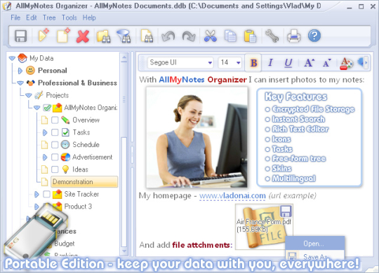 AllMyNotes Organizer Portable je jednoduché řešení pro bezpečné ukládání vašich poznámek! Je to přenosná verze programu AllMyNotes Organizer pro USB, iPod nebo vyměnitelný disk.