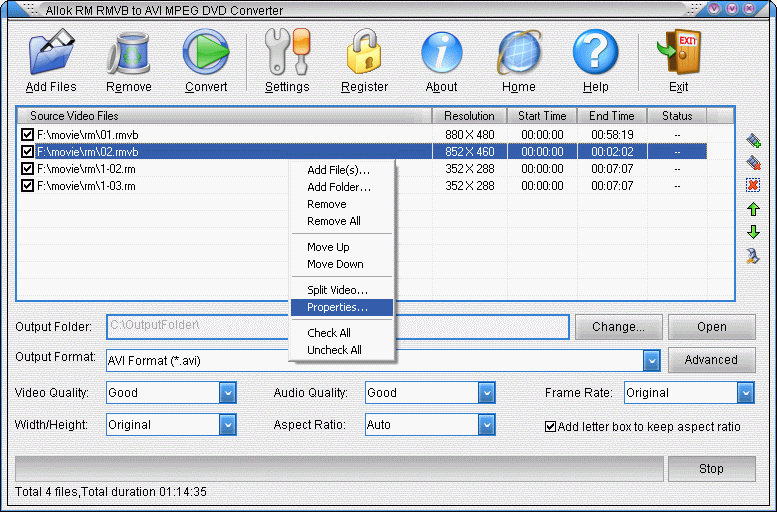 Allok RM RMVB to AVI MPEG DVD Converter je kvalitní RealMedia konvertor určený pro převod RM, RMVB do AVI, DivX, Xvid, MPEG1, MPEG2, VCD, SVCD, DVD, WMV formátů. Podporuje také konvertování RM, RMVB souborů do DVD-Video souborů (VIDEO_TS, AUDIO_TS) a VCD/SVCD image (*.bin, *.cue), takže můžete snadno vypalovat VCD/SVCD/DVD z vašich RM, RMVB souborů.