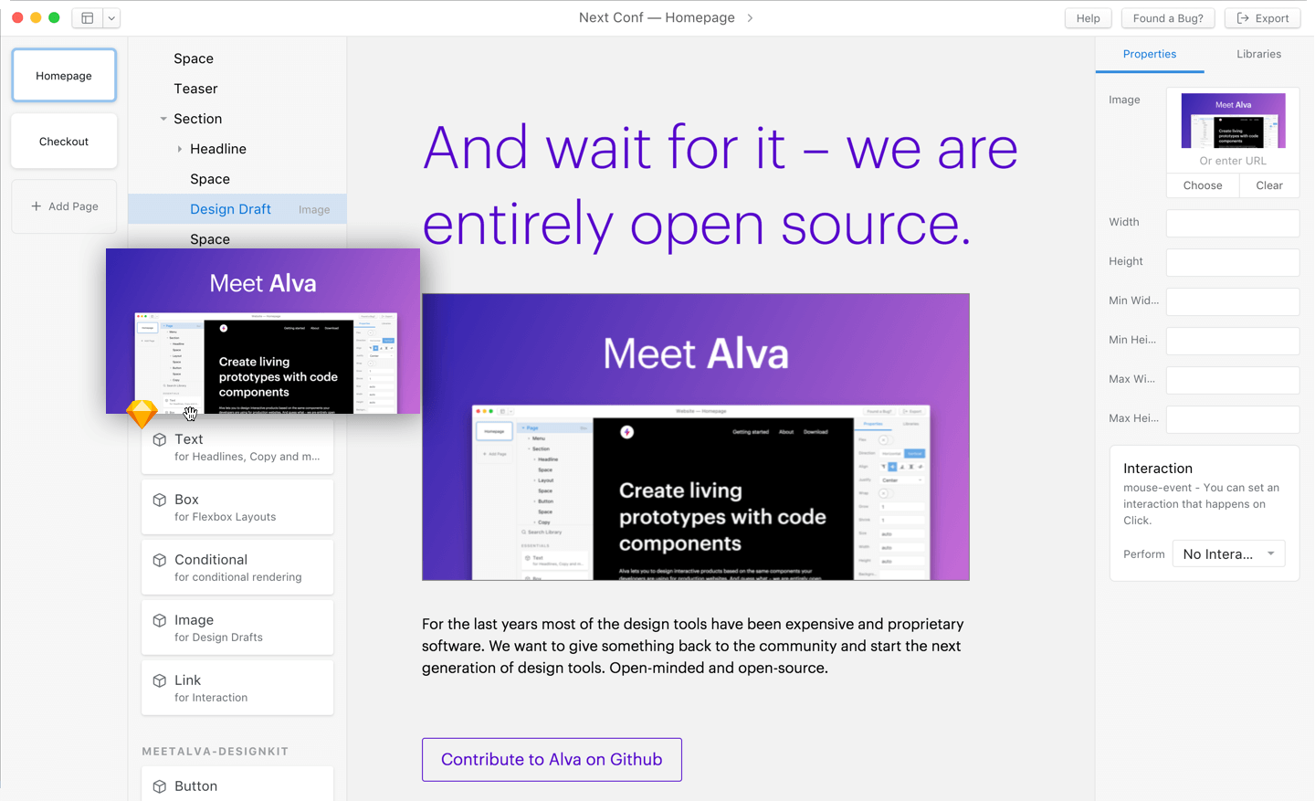 Alva umožňuje navrhnout interaktivní produkty založené na součástech vyvinutých vašimi vývojáři a také lze pracovat se stejnými komponentami a sdílet knihovnu objektů. Ulehčuje komunikaci mezi webdesignerem a programátorem. Projekt sestavíte z jednotlivých objektů (rozbalovací nabídky, tlačítka, menu, obrázky, layouty, textové boxy atd.). Program obsahuje i nástroje pro vývoj (editor kódu, funkce pro ladění, konzole atd.).