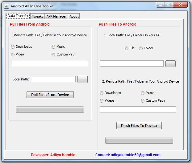 Android All In One Toolkit je nástroj pro tvorbu workflow pro snažší věci, jako je přenos dat z PC do telefonu a naopak, spíše než připojení mass storage přes USB můžete přenášet data pomocí tohoto nástroje přes ADB. Není potřeba jakéhokoliv příkazu stačí použít tento nástroj pro věci, jako jsou funkce: 1. Rychlý přenos dat pomocí ADB (místo SD karty) 2. Tweaky pro Android 3. Build Prop Editor 4. Android Manager APK