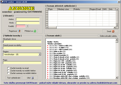 Tento program slouží k vyhledávání inzerátů v Annonci. Inzeráty jsou hledány v pravidelných intervalech na základě vašich kritérií. Služba běží na serveru, nepotřebujete tak mít zapnutý počítač ani listovat annoncí. Informace o nových inzerátech jsou okamžitě odesílány na email a mobilní telefon.