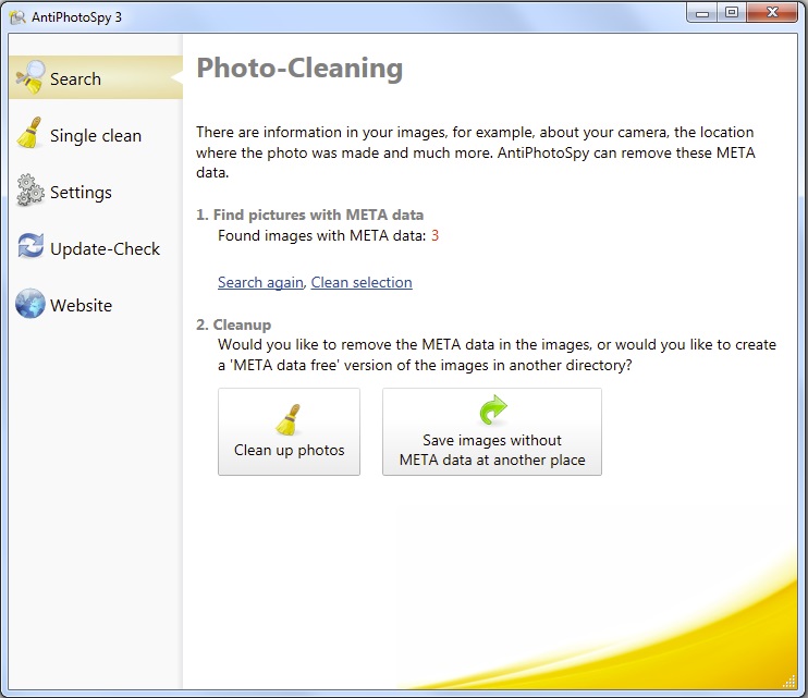 S AntiPhotoSpy můžete snadno vyhledávat na vašem počítači v dávkovém režimu pro fotografie a grafiky s metadaty a odstranit ty citlivá data, a to i na jeden zátah. Můžete také jednoduše ukládat všechny soubory bez metadat v samostatné složce.