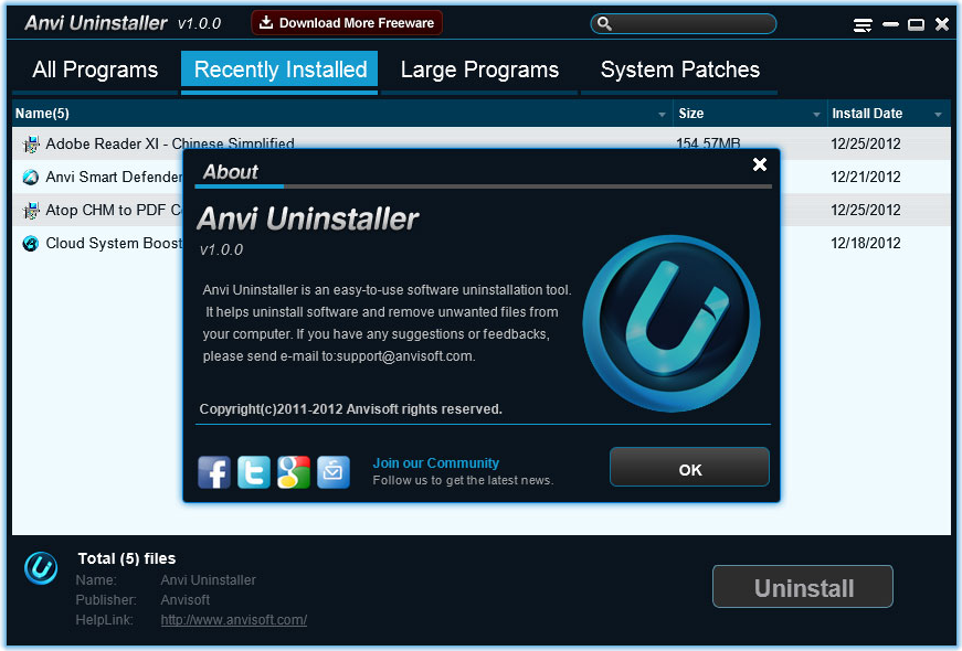 Anvi Uninstaller je šikovný nástroj, který pomůže uživatelům pohodlně a efektivně odinstalovat nepotřebné programy. Poskytuje bezpečnost a jednoduchost v čele s rozhraním, které mapuje několik nabídek, včetně všech programů, nedávno nainstalovaných, velkých programů a opravy systému.
