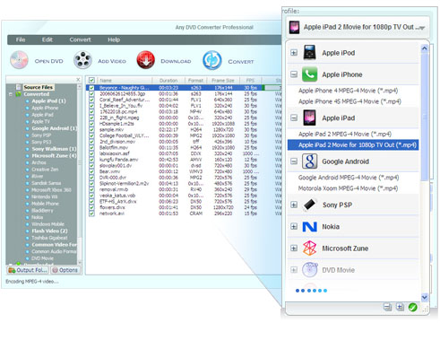 Any DVD Converter Pro je kvalitní software skládájící se z DVD ripovacího nástroje a video konvertoru. Je to pomocník pro ripování vašich oblíbených DVD filmů do všech populárních video formátů (AVI, MPEG, WMV, DivX, RM, MOV, 3GP). Program také konvertuje tyto video soubory mezi sebou rychle a ve vysoké kvalitě (DivX, XviD, MOV, rm, rmvb, MPEG, VOB, DVD, WMV, AVI do MPEG nebo MPEG-4 formáty pro iPod, Zune, PSP).