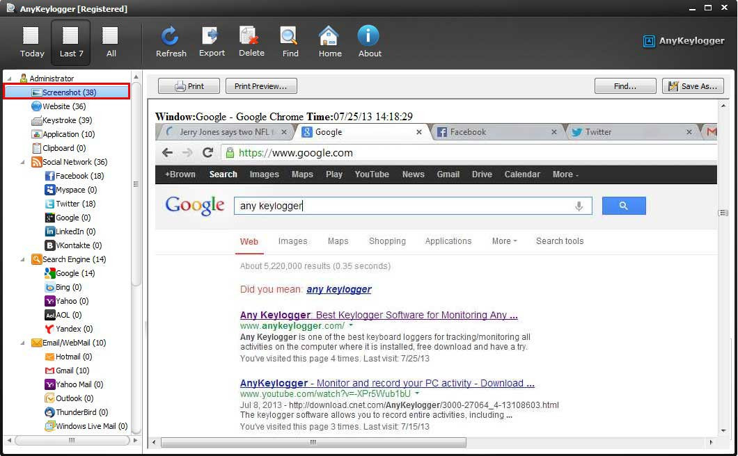 Any Keylogger je program pro sledování aktivit uživatelů na počítači. Umožňuje pořizovat snímky obrazovky, zaznamenávat navštívené webové stránky, stisknuté klávesy a další aktivitu. Any Keylogger lze použít pro monitorování dětí, zaměstnanců nebo jiných uživatelů počítače.