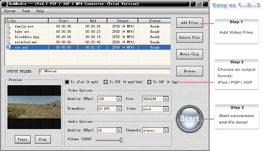 AoA iPod/PSP/3GP/MP4 Converter rychle překonvertuje vaše videa do formátu kompatibilního s přenosným zařízením (Sony PSP, iPod Video, Apple TV, 3G mobilní telefon, MP4 přehrávač).