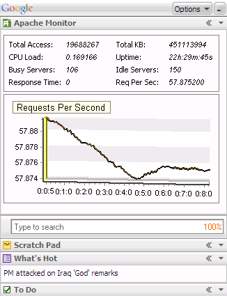 Apache Monitor je plugin pro Google Desktop Search, který monitoruje server Apache.Je integrovány do postranního panelu Google, a to umožní zkontrolovat stav vašeho webového serveru Apache bez otevření prohlížeče.