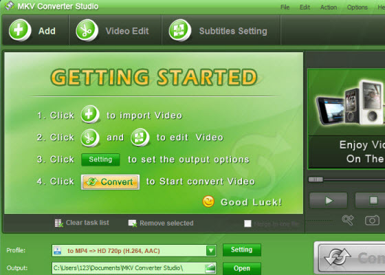 Apowersoft MKV Converter Studio je vynikající nástroj pro konverzi MKV souborů. Podporuje konverzi MKV do téměř všech populárních video formátů a podporuje MKA souborů do audio formátů, jako jsou MP3, WMA, AAC, OGG a M4A. Podporuje převod titulky v MKV videa, nebo importovat titulky pro videa z externích souborů, jako například .srt,. sub, .ssa, .ass, .smi, .psb, .tex a .idx. Po konverzi MKV souborů, soubory budou plně kompatibilní s digitálním přehrávačem, jako je Apple TV, Zune, Android telefon, iPad, MP4 přehrávač, PSP, BlackBerry, iPhone, PS3 a mnoho dalších.