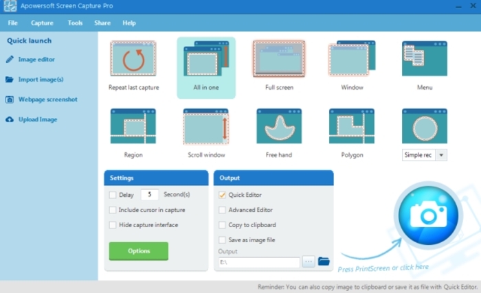 Apowersoft Screen Capture Pro je nástroj, který slouží k pořízení záznamu činnosti na obrazovce nebo snímků obrazovky. Díky uživatelsky přívětivému rozhraní, jste schopni rychle přistoupit k funkcím v tomto programu. Ať už je to rychlý snímek nebo snadné nahrávání obrazovky, Apowersoft Screen Capture Pro vám umožní využít všechny z nich. Upravené obrázky lze exportovat do formátu PNG, JPEG, BMP, GIF nebo TIF. Video se ukládá do formátu WMV, dále můžete nastavit video kodek, bitrate a počet snímků za sekundu.