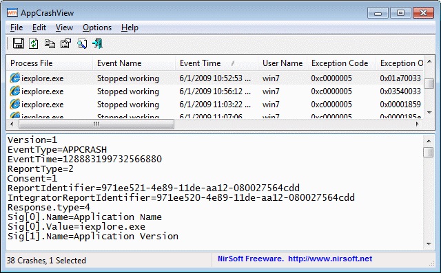 AppCrashView je malý nástroj pro systém Windows Vista a Windows 7, který zobrazuje podrobnosti o všech zhroucení aplikací, ke kterým došlo ve Vašem systému. Informace o pádech se extrahují pokaždé, když dojde k chybě z .wer souborů vytvořených Windows Error Reporting (WER), což je součást operačního systému. AppCrashView také umožňuje snadno uložit seznam jako text / csv / html / xml soubor.