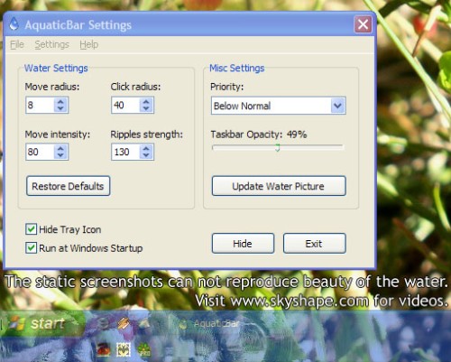 AquaticBar je jednoduchá aplikaci, která zobrazuje vlnící se hladinu vody pod nástrojovou lištou Windows. Přejetím myši po hladině se voda rozvlní a ukazují se další realistické efekty.