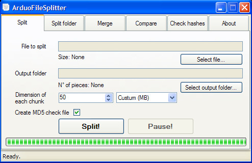 ArduoFileSplitter je výkonný a snadno použitelný nástroj pro dělení a spojování souborů. Podporuje všechny typy souborů, včetně videí, hudby, obrázků a dokumentů. Můžete si vybrat z předdefinovaných velikostí částí nebo nastavit vlastní velikost. ArduoFileSplitter také vytváří MD5 soubory, které certifikují správnost jednotlivých částí. S jednotlivými částmi můžete normálně zacházet jako s klasickými soubory a v případě potřeby je opět spojíte dohromady. ArduoFileSplitter také umožňuje porovnávání jednotlivých částí souborů a dělení a spojování adresářů s celými jejich obsahy.