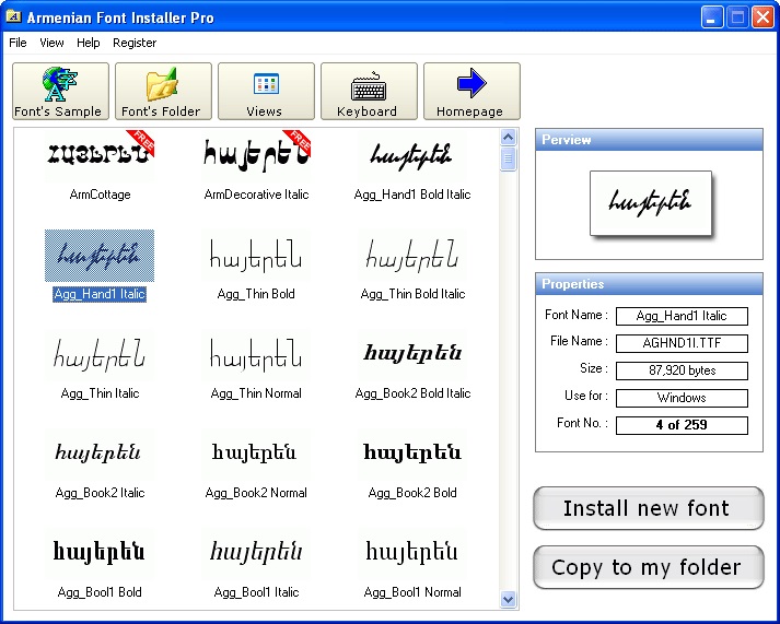 Armenian Font Installer Pro je unikátní program pro Armény, nebo každého, kdo pracuje na arménské literatuře či textech s více než 250 arménskými fonty pro Windows (Win), Macintosh (Mac) a MS-DOS operační systémy. Obsahuje více než 250 krásných arménských fontů se vzorkem písmem, které ti umožní prohlédnout si styl písma před instalací.