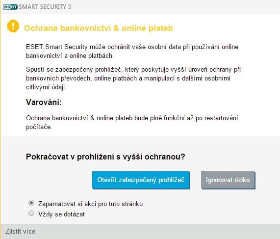 Zabezpečený browser ESET spustí v momentě, kdy zjistí, že přistupujete k rozhraní online plateb. Podstata zabezpečeného prohlížeče spočívá v naprostém oddělení jeho funkcí od ostatních internetových aktivit, proto také jeho vývojáři důrazně doporučují uživatelům, aby ho používali pouze pro platební transakce. Šifrované spojení mezi klávesnicí a prohlížečem pak zabraňuje tomu, aby byly zachyceny jakékoliv identifikační údaje a hesla na tomto spojení malwarem typu keylogger.