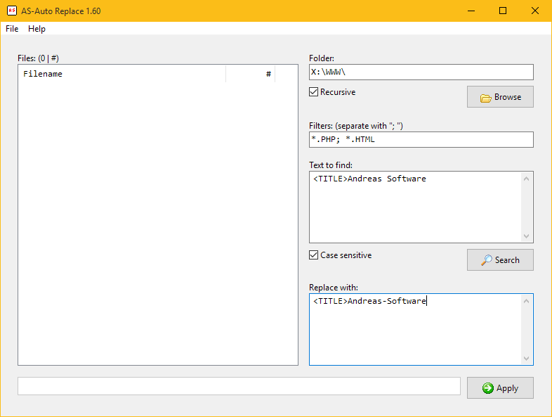 AS-Auto Replace je program, který je určen k usnadnění vyhledávání a nahrazování více textových souborů najednou. Zobrazuje počet výskytů hledaného výrazu pro každý soubor.Je ideální pro web a vývojáře softwaru! Program pracuje velmi rychle a je snadno ovladatelný.