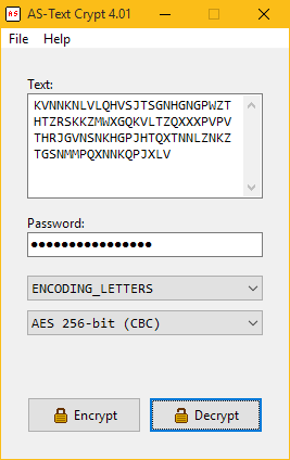 AS-Crypt Text je nástroj pro šifrování a dešifrování textu, který používá buď šifrovací algoritmus AES nebo Blowfish (a to jak v režimu CBC) s 128- nebo 256 bitů. Zakóduje šifrované informace pro snadnější manipulaci. Program může být také použit pro kódování pouze textu a to s pomocí HEX nebo jiných metod kódování. Kromě nabídky HEX, jsou dva způsoby kódování, jeden pouze s písmeny a druhý jen se symboly. V současné době je také 384-bit Blowfish šifrování.
