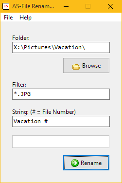 AS-File Renamer je nástroj, který se používá k hromadnému přejmenování souborů pomocí numerické inkrementace. Na začátku musíte vybrat zdrojovou složku a nastavit filtrování.