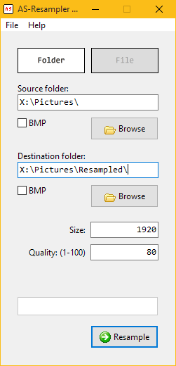 AS-Resampler je nástroj, který podporuje všechny * .jpg nebo * .bmp soubory ze zdrojové složky, pro převzorkování a ukládání do cílové složky. Algoritmus použitý pro převzorkování je Lanczos3 - což přináší vynikající kvalitu! Tato aplikace je ideální pro kopírování s nízkým rozlišením originálních obrazů a pro publikování na webu.