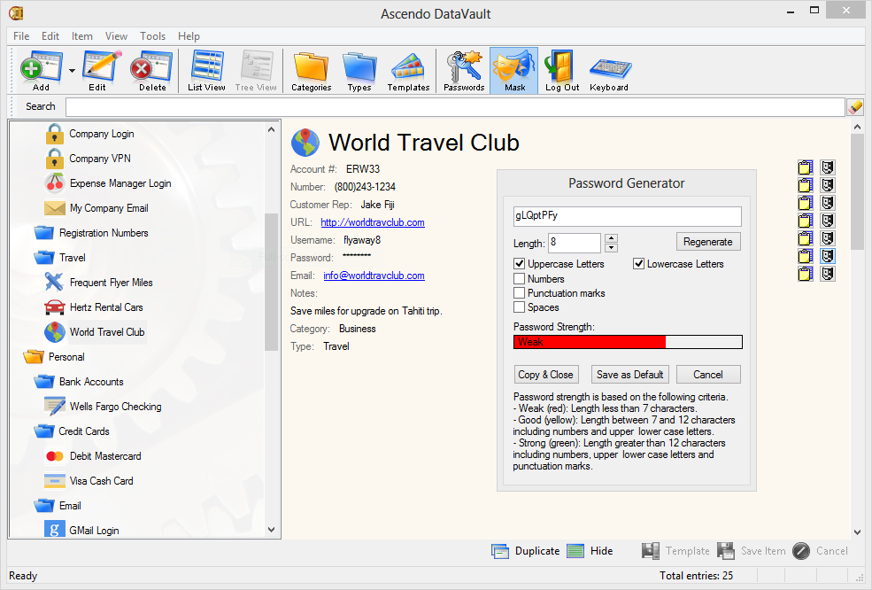 Ascendo DataVault je aplikace, která ukládá soukromé informace pomocí podpory šifrovacího standardu AES. Ten obsahuje velmi důležité funkce, včetně pokročilého nastavení zabezpečení. V dalších funkcích tohoto nástroje je automatické zálohování, synchronizaci s mobilními verzemi nebo integraci s prohlížečem pro automatické vyplňování přihlašovacích formulářů.