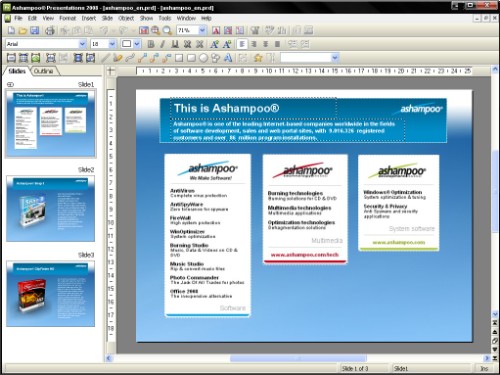 Ashampoo Presentations umožňuje vaše prezentace zobrazovat jako slideshow, jejich export do obrázků a poskytuje další užitečné funkce jako např.: animace, vkládání úžasných efektů a přechodů, vkládání videa nebo zvukových souborů, tvorba interaktivních prezentací, změna barevných schémat atd. Ashampoo Presentations příchází s více než 40 atraktivními šablonami.
