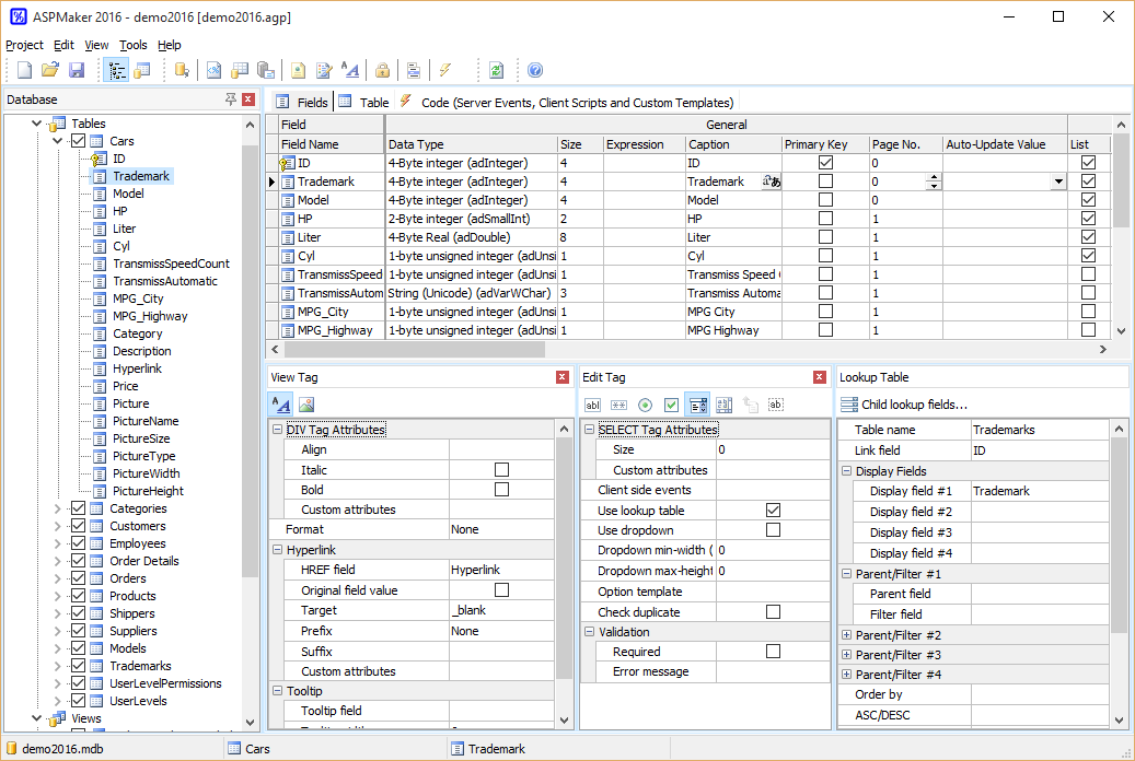 ASPMaker je výkonný ASP generátor kódu, se kterým můžete vygenerovat kompletní sadu ASP (Active Server Pages) z databáze Microsoft Access, SQL Server nebo jiných databází podporující ODBC. Pomocí ASPMaker, můžete okamžitě vytvořit webové stránky, které umožňují uživatelům prohlížet, upravovat, hledat, přidávat a odstraňovat záznamy na webu. ASPMaker je navržen pro vysokou flexibilitu, nabízí řadu možností jak vytvářet ASP aplikace. Vygenerované kódy jsou čisté, jednoduché a snadno přizpůsobitelné. ASPMaker vám může ušetřit spoustu času a je vhodný pro začátečníky i zkušené vývojáře.