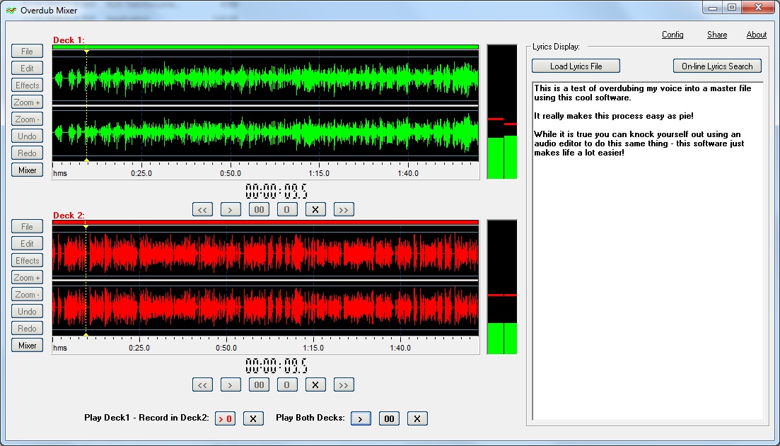 Audio Overdub Mixer je speciální nástroj, který umožňuje mixování hudebních souborů. Podporuje MP3, WMA, WAV formáty. Obsahuje dva nezávislé audio editory a každý z nich mí možnost nahrávat z jakéhokoli zdroje. Aplikování efektů je následně snadné. Podporuje velké soubory.