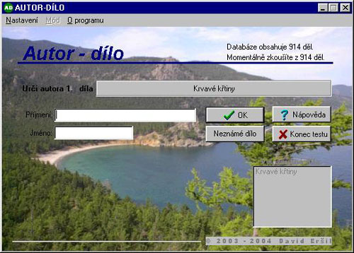 Databáze programu obsahuje více než 1300 nejvýznamnějších děl od více než 300 českých i světových autorů, od počátku písemnictví až téměř do současnosti, jež jsou náplní výuky na gymnáziu. Můžete si také vybírat okruhy ke zkoušení. Vaším cílem je správně určit autora u každého z 20 náhodně vybraných literárních děl. Na konci testu budou vaše znalosti ohodnoceny známkou jako při školním zkoušení.