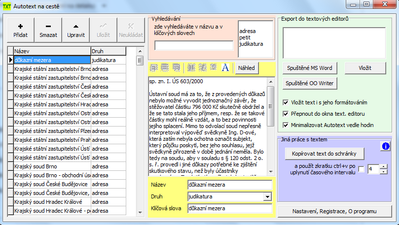 Autotext na cestě je program, jehož filosofie programu je založena na tom, že při práci na počítači je nutné často vkládat do dokumentů velké množství opakujícího se textu. Aby uživatel nemusel tento pracně vypisovat, Autotext uchovává tento automatický text ve svojí databázi a uživatel velmi jednoduše požadovaný text najde a vloží do otevřeného textového editoru, rozepsaného emailu apod. V základní databázi program obsahuje adresy soudů a státních zastupitelství. Automatický text si můžete dle svého zformátovat. Programu umí tento automatický text exportovat do otevřených dokumentů MS Word a nebo OpenOffice, či pouze zkopírovat do schránky pro následné vložení do dalších programů.