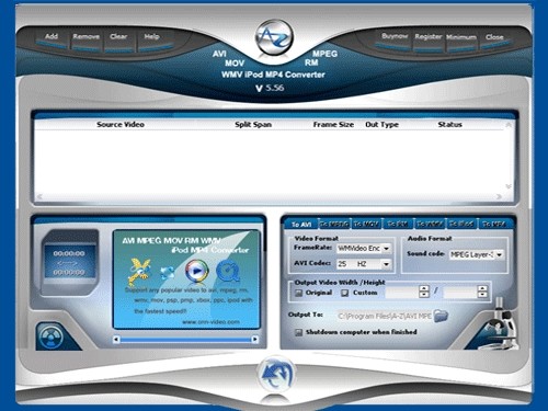 AVI MPEG MOV RM WMV iPod MP4 Converter slouží pro konvertování jakýchkoliv video souborů do avi divx xvid mpeg mov wmv rm rmvb zune ipod mp4 swf flv 3gp psp pmp ppc xbox mp3 gif.