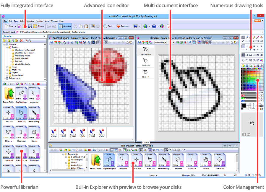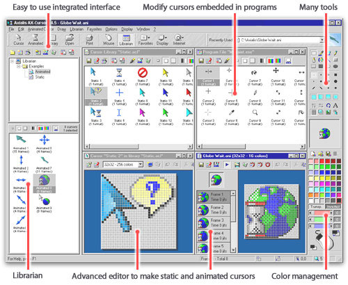 Axialis CursorWorkshop je aplikace pro vytvoření všech možných druhů kurzorů s velikostí od 16x16 po 72x72 s až 16,8 miliony barvami. šipka, ruka či přesýpací hodiny se jednoduše přemění podle vašeho přání.