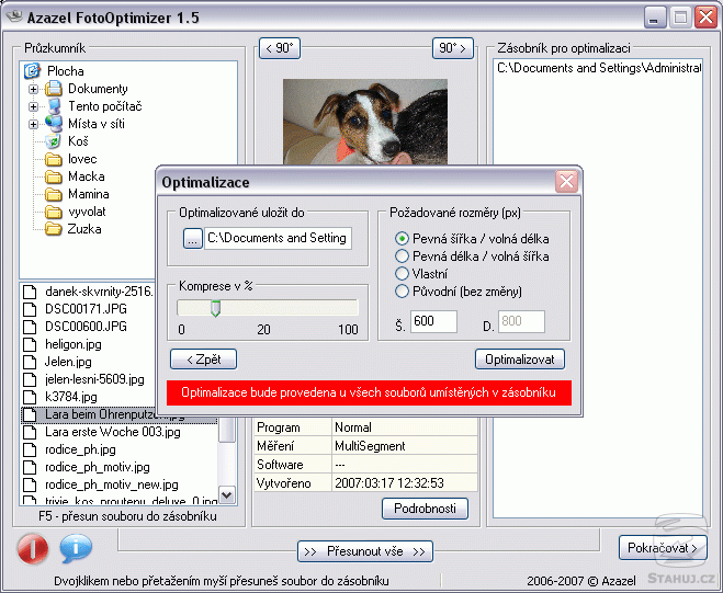 S touto malou utilitkou lze dát takovým nočním můrám sbohem. Dokáže totiž optimalizovat jak jednu fotografii, tak i celé množství fotografií naráz. Stačí pouze požadované snímky přesunout do "zásobníku pro optimalizaci", zvolit parametry optimalizace, určit kam se mají výsledné snímky uložit a pak už jen spustit proces, jehož průběh je graficky zobrazen.