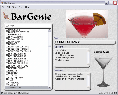 S pomocí tohoto jednoduchého programu vykouzlíte jakýkoliv koktejl, stačí si jen vybrat z nabídky až 26600 nápojů. U každého receptu je podrobně popsán návod k přípravě a přidána fotografie.