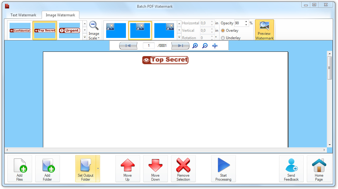 Batch PDF Watermark je snadný na použití. Stačí přidat své PDF dokumenty do programu, vybrat typ vodoznaku, který chcete přidat, a nastavit jeho parametry. Poté klikněte na tlačítko "Přidat vodoznaky" a program přidá vodoznaky do vašich PDF dokumentů.