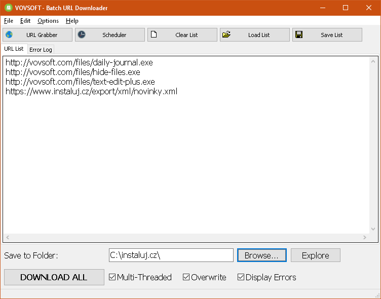 Batch URL Downloader umožňuje stahovat najedou několik souborů z různých webů. Stačí vložit seznam url odkazů a spustit stahování, program následně tyto soubory hromadně stáhne a ti buď najednou a nebo jeden po druhým dle jejich pořadí. Stahování je možné i naplánovat na určitý interval, který se má opakovat např. stahování každých 60 sekund, v PC tak budete mít vždy aktuální soubor. Poradí si i s velkými soubory, zabezpečením https a odkazy aplikace dopbox.